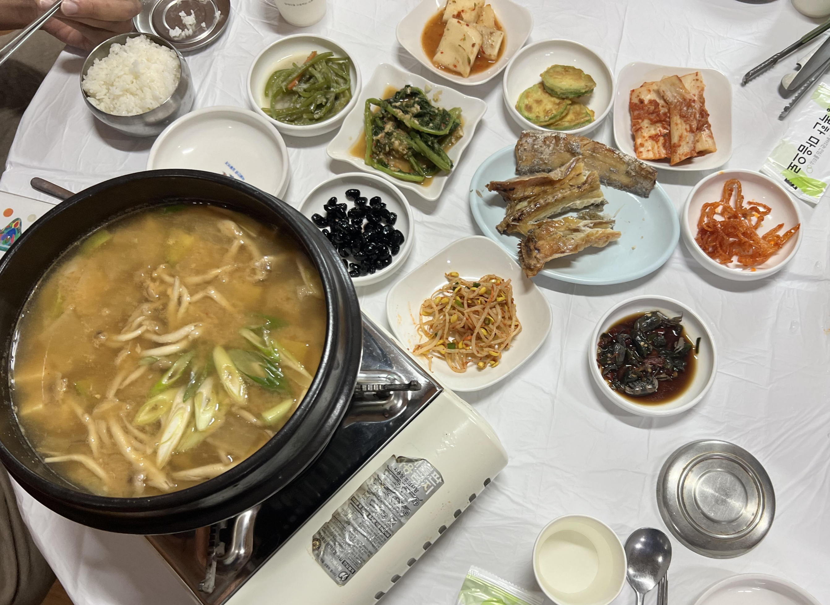 된장찌개는 바지락, 버섯, 호박, 감자, 두부 등이 들어가 있음.
