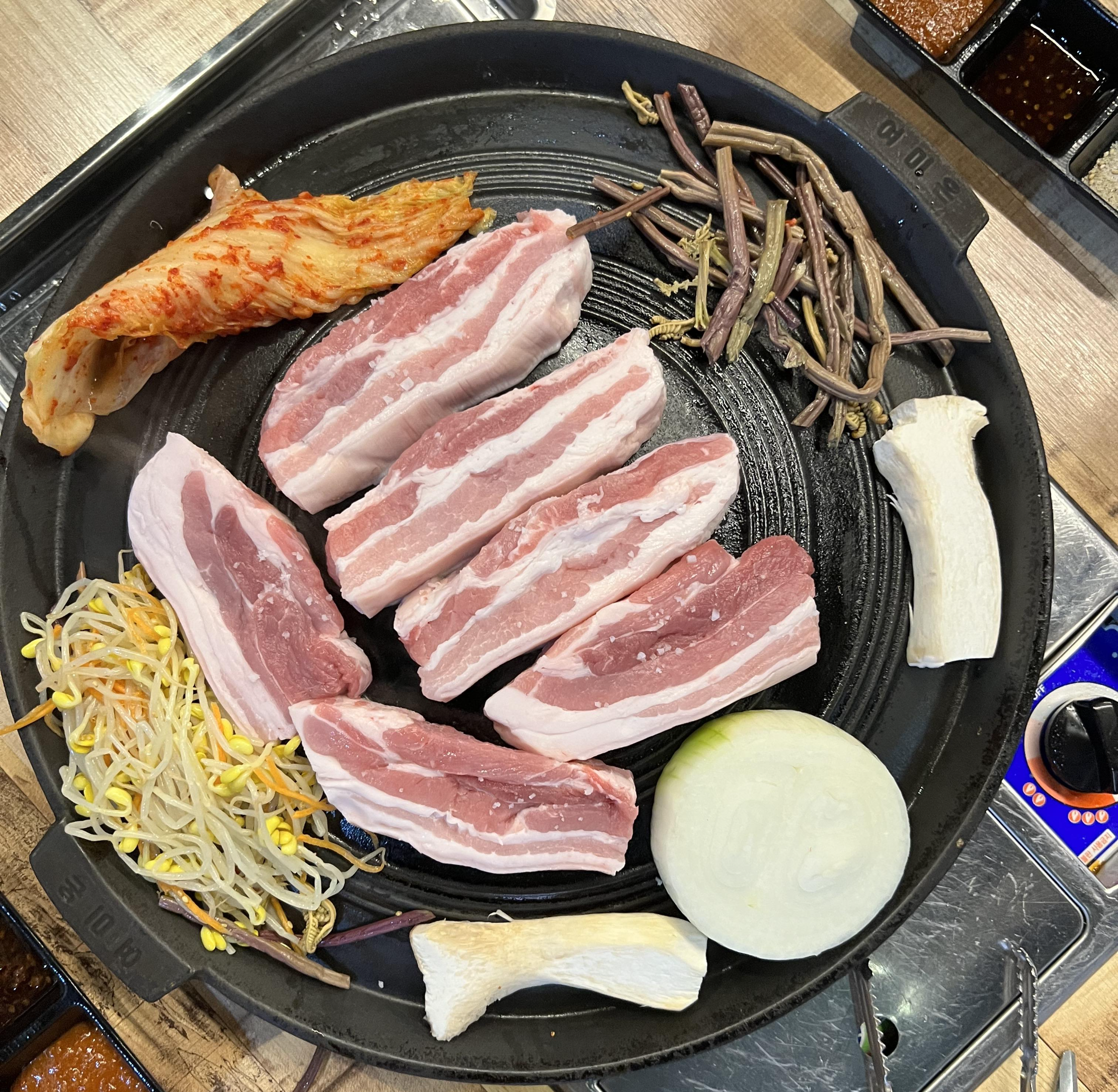 고기가 나오면 콩나물, 김치, 고사리, 버섯, 양파를 같이 올려 굽는다.