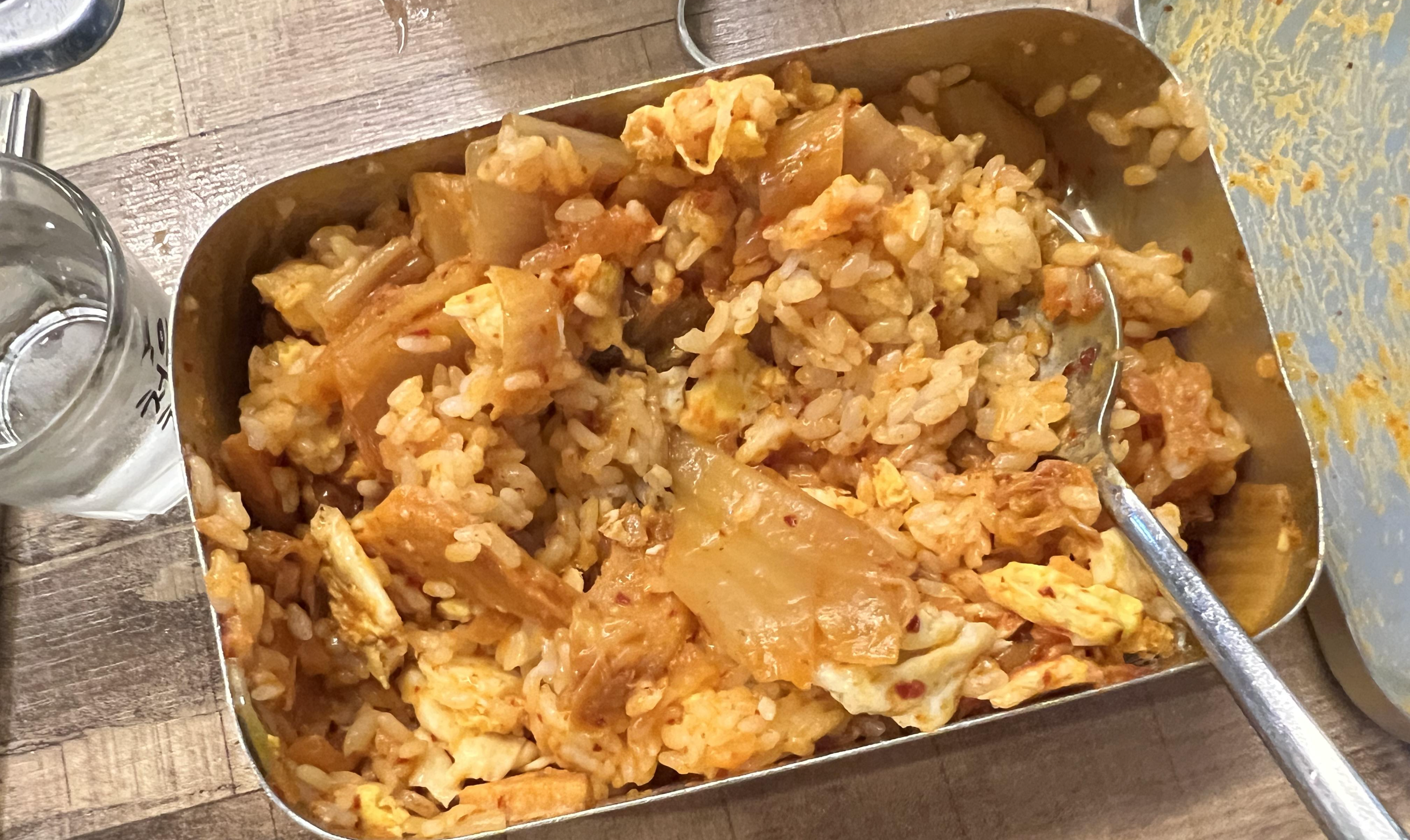 옛날 도시락을 시켜 먹었는데 계란후라이, 볶은 김치, 분홍 소시지가 들어있다.