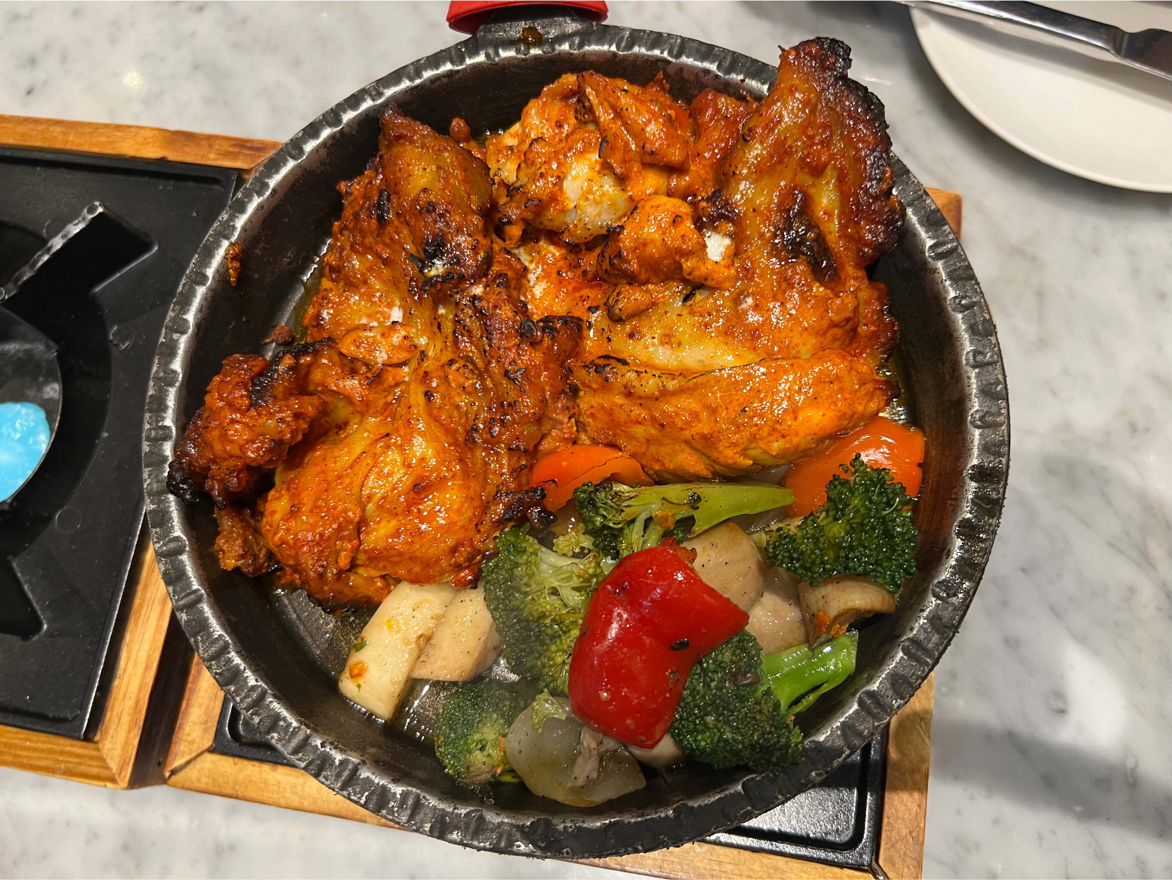 제일 먼저 나온 것은 탄두리 치킨이었고 음식이 식지 말라고 아래 고체연료에 불을 붙인 뒤 올려준다.