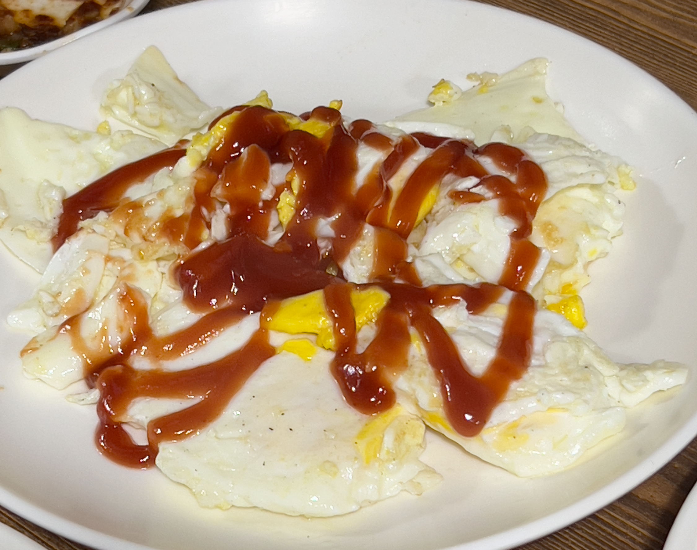 다음 사이드로 주신 계란 후라이. 위에 케찹이 뿌려져있고 완숙으로 해주심. 역시 맛집 스웩답게 계란 역시 모양은 신경쓰지 않고 부쳐주심.