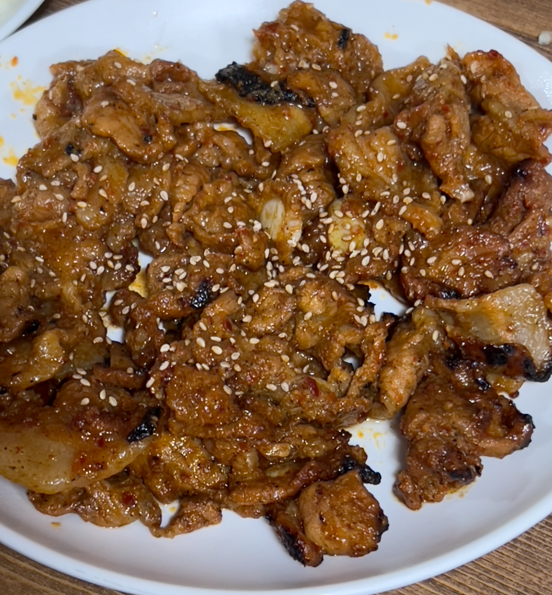 먼저 나온 메뉴는 석쇠구이로 주문을 하면 나가서 구워서 가져다 주신다. 고추장 베이스 양념이고 약간 매콤한 맛이 있다. 약간의 불향이 있고 간은 그렇게 강하지 않아 밥없이 그냥 먹어도 될 정도.