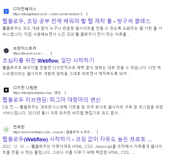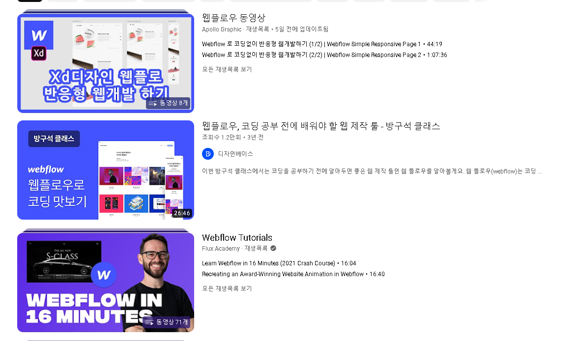 구글에 웹플로우를 검색하면(한글로) 글이 상당히 많이 나온다. 간단히 찍먹을 한 글도 있는 반면 인프런이나 기타 강의 사이트의 강의 페이지도 나온다. 물론 유튜브에 검색을 하면 강의 동영상도 많이 나온다.