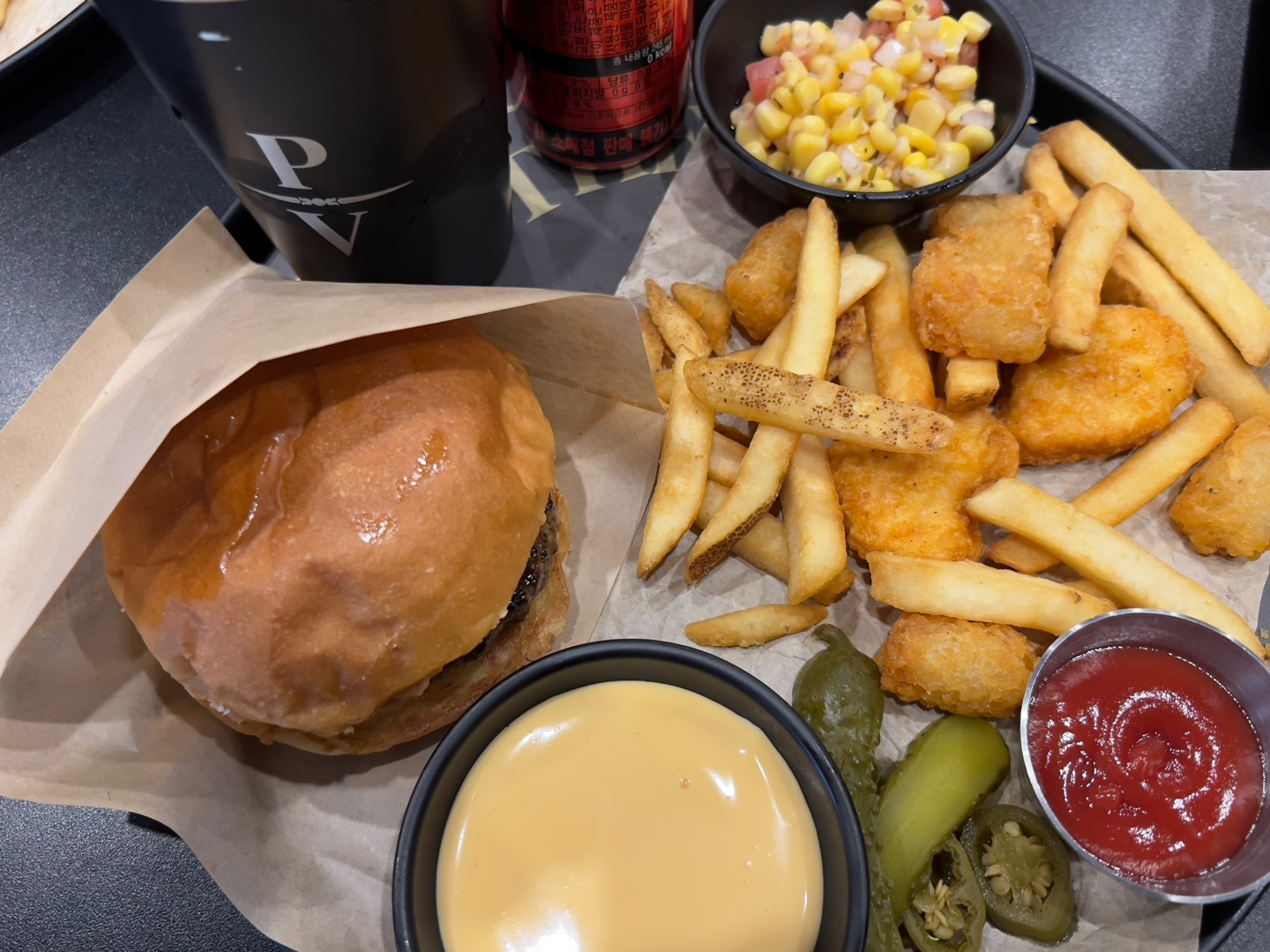 버거, 콘샐러드 음료 튀김즈(감튀, 너겟), 피클(오이, 할라피뇨)와 소스로 구성되어 있음