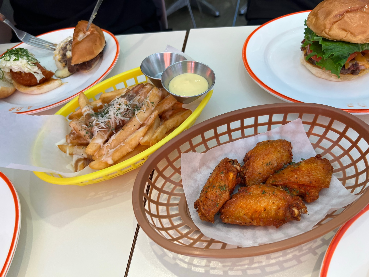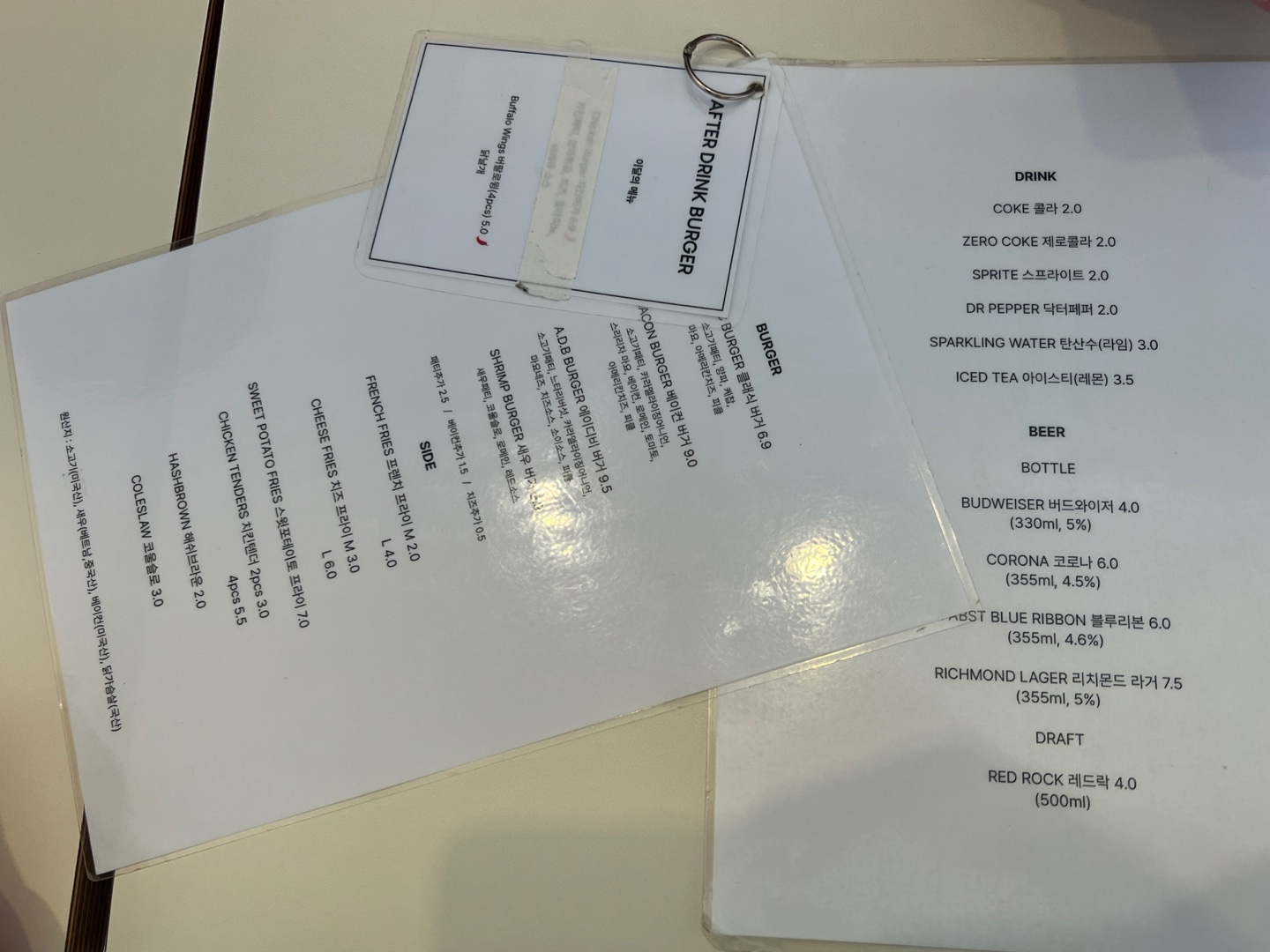 버거는 클래식, 베이컨, ADB 새우 버거가 있고 사이드 메뉴로는 감자튀김이나 너겟 등이 있다.